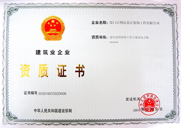 廈門百利達設計裝飾資質證書乙級
